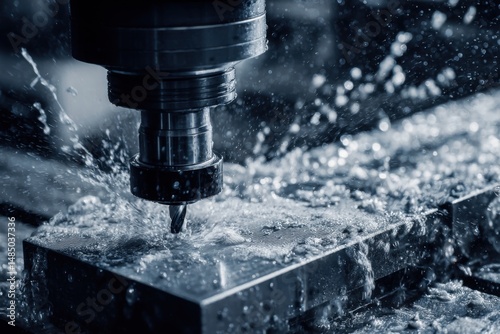 Metal Milling Machine Cutting Metal Block with Coolant Spray Close Up Industrial Precision