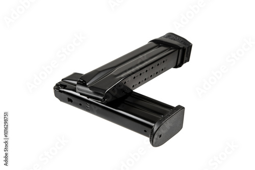 Metal pistol magazine for 9 mm cartridges. Clip for ammunition. Isolate on a white back.
