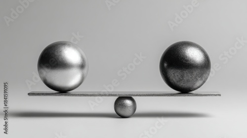 Metal spheres balanced on narrow beam representing equilibrium, stability, fairness and balance concept in abstract minimal composition