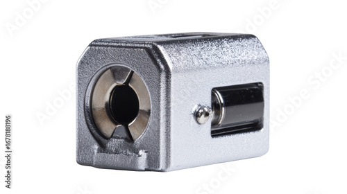 Metal tool component with a shiny surface and detailed mechanics, isolated on a white background.