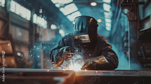 Metal worker wearing protective workwear while welding metal at a factory emphasizing industrial safety and manufacturing processes