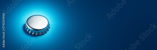 Metallic bottle cap with glowing light on blue background and empty copy space for packaging, branding or beverage design concept mockup template. Ai generative