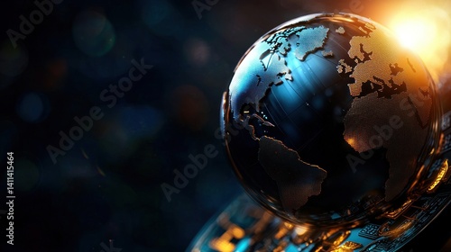 Metallic Earth globe, dark background, sunrise, technology