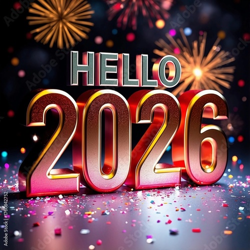 Metallic “HELLO 2026” text with fireworks and confetti on festive dark background