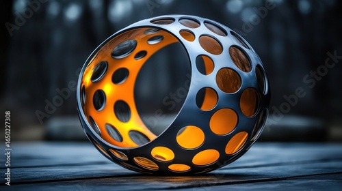 Metallic sphere with a ring of holes, glowing orange interior, on a dark wooden surface. Abstract, futuristic design