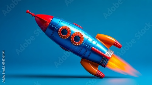 Metallic toy rocket blasts off with fiery orange exhaust against a solid blue background