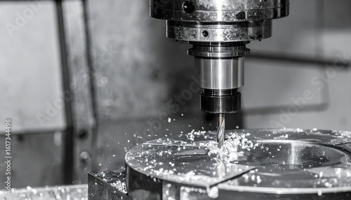 Metalwork CNC milling machine in operation, carving precise shapes into solid metal in a high-tech industrial workshop environment. Suitable for marketing or business purposes