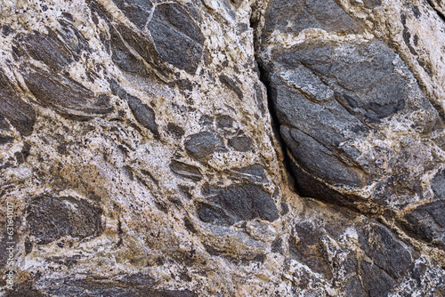 Metamorphic Gneiss rock background with texture and black and white layers. Quartz diorite to quartz monzonite gneiss. Found in the Big Morongo Canyon Preserve in Morongo Valley, California.