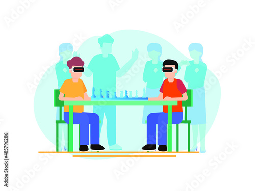 Metaverse game vector concept. Two young men wearing VR goggles while playing chess game in the metaverse