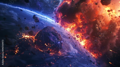 Meteor Impact with Earth, fireball Asteroid In Collision with Planet Earth in deep space