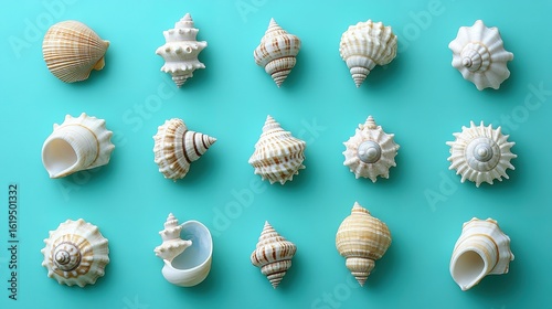 Meticulous Grid of Diverse Seashells on a Vibrant Turquoise Background