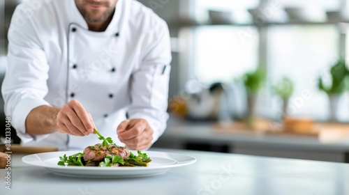 Meticulously Plated Gourmet Dish by a Professional Chef in a Blurred Kitchen Setting