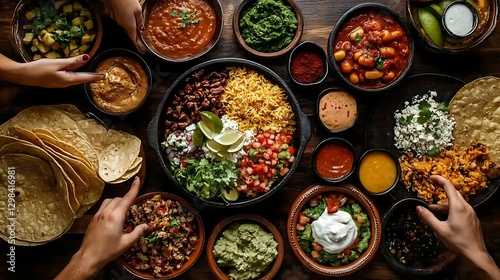 Mexican Feast with Traditional Dishes, A vibrant Mexican feast with various traditional dishes on a wooden table