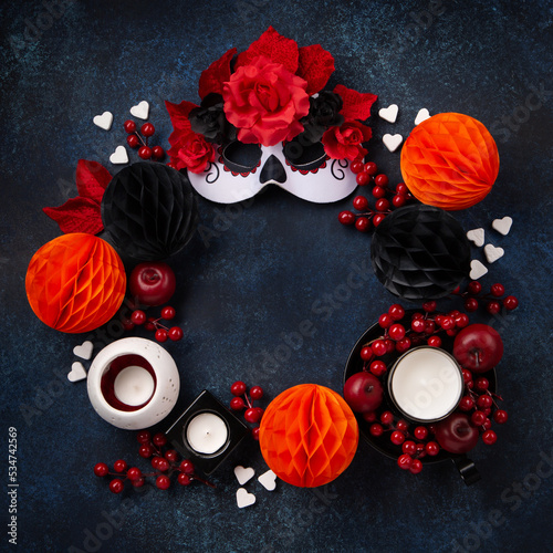 Mexican Objects on Dark Blue Background. Mexican Holiday Day of the Dead and Halloween, Dia de Los Muertos.