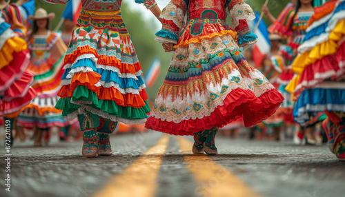 Mexican people celebrate Independence Day on the street. Festival, dance, party, fun. Bottom view