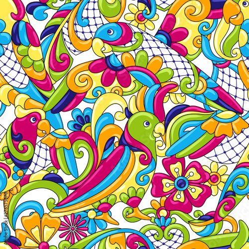 Mexican talavera ceramic tile pattern with tropical parrots.