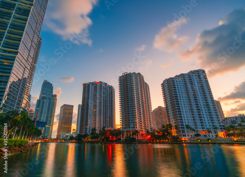 Miami florida Brickell key skyline at sunrise buildings architecture vacation