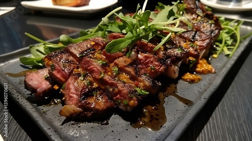 Michelin star style plating of saffron aioli deep purple elderberry glaze and bright green herb yogurt