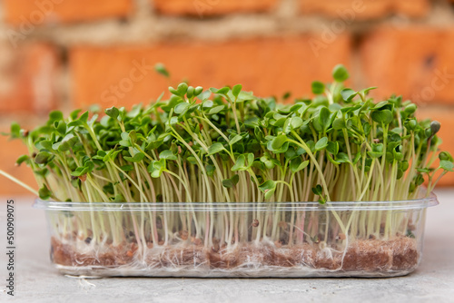 Micro green fresh sprouts. Eco farming. Healthy and fresh vegan food. Organic raw green food. Different types of micro green sprouts. Growing microgreens. Seed germination at home. Windowsill garden.