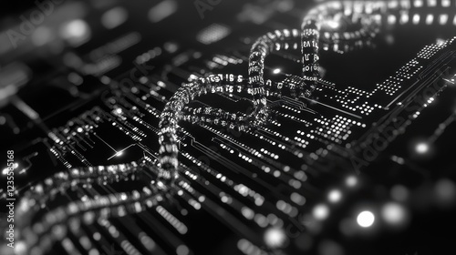 Microchip merging with biological DNA strand side view cybernetic tone Black and white.