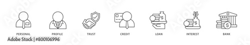 Microcredit icons set collection illustration of personal, profile, trust, credit, loan, interest and bank icon live stroke and easy to edit