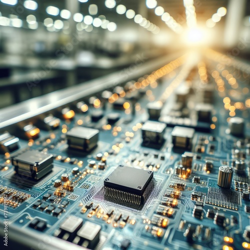 Microelectronics, connections, parts, microchips on a table at a factory in bright lighting. Modern technology, innovation, production of computers