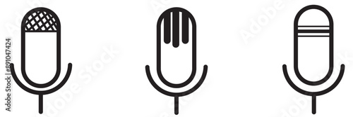 Microphone icon set. audio speech podcast mic vector symbol. thin line microphone pictogram. voice record mike icon in black filled and outlined style.