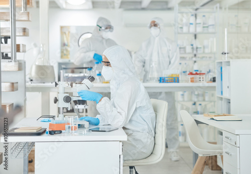 Microscope, ppe and scientist checking virus, test results or pharmaceutical innovation with mask. Safety, person or lab technician at desk in bacteria research, medical danger or vaccine development