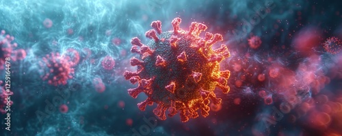 Microscopic 3d visualization of coronavirus cell structure in blue and red colors. Scientific medical research covid virus illustration with copy space for pandemic concept