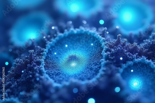 Microscopic Cellular Structures Glowing Blue Abstract Artwork