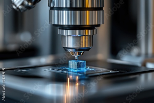 Microscopic examination of a small, glowing blue cube on a metallic surface.