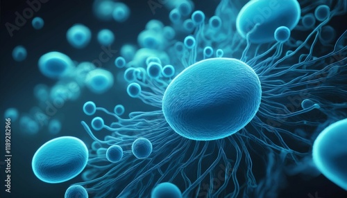 microscopic view of blue bacteria cells in 3d rendering