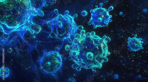 Microscopic view of colorful viruses, showcasing intricate details and structures in a vibrant, scientific representation.
