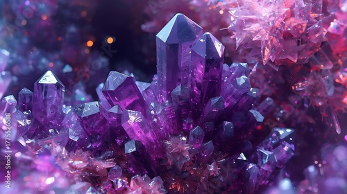 Microscopic view of crystalline structure, sharp focus, vibrant amethyst and sapphire colors, scientific.