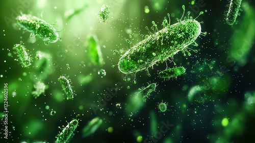 Microscopic view of green E. coli bacteria in vibrant environment, showcasing their unique shapes and structures