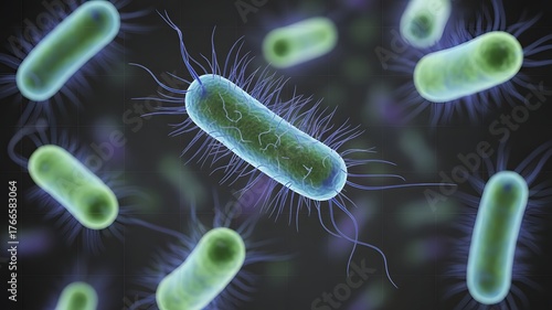 Microscopic view of vibrant, rod shaped bacteria with flagella exhibiting cellular life and scientific research concepts