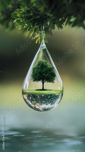 Microscopic world inside a water droplet with a tree