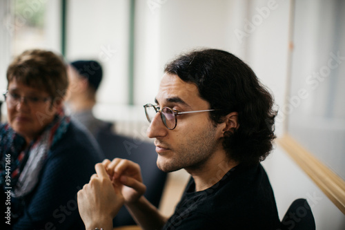 Mid adult man listening during informal meeting, Sweden