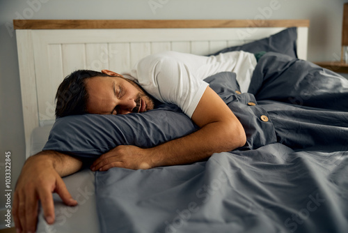 Mid adult man sleeping in bedroom.