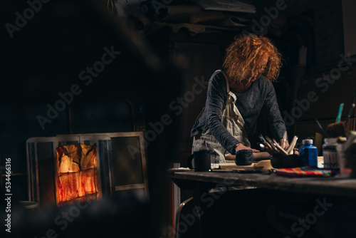 mid adult woman craftsman working with pottery in her work shop
