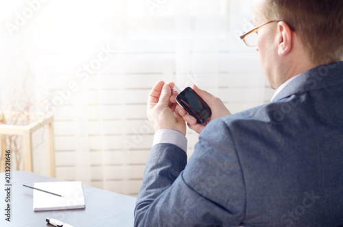 Mid age Man doing blood test with personal glucometer