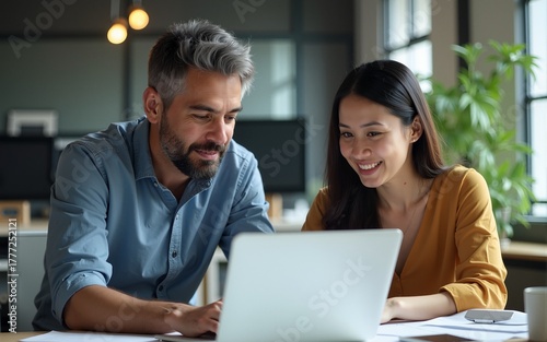 Mid aged Latin male manager mentor teaching young Asian female worker looking at laptop discussing corporate strategy in teamwork, working on computer in office at international team meeting.