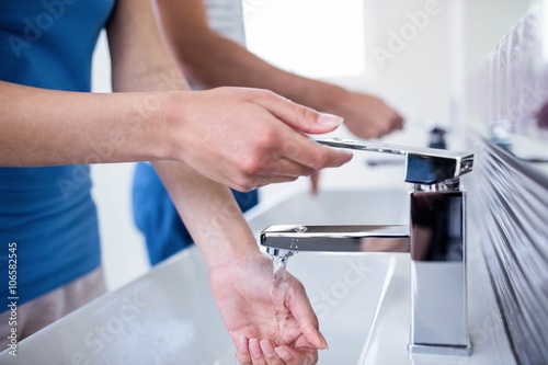 Mid section of couple in bathroom