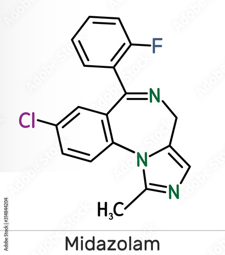 Midazolam molecule. Is a short-acting drug with anxiolytic, anticonvulsant, hypnotic, muscle relaxant, sedative, amnesic properties. Skeletal chemical formula