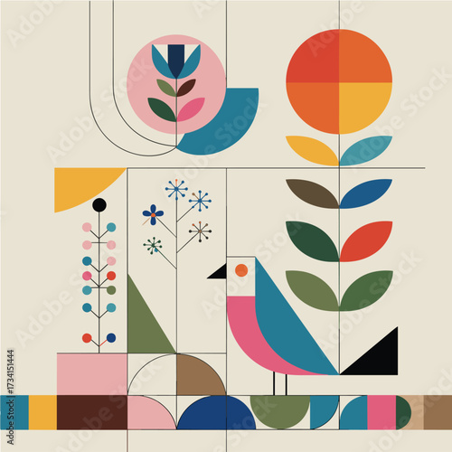 Mid-Century Modern Bird and Nature Geometric Illustration