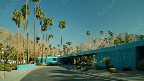 Mid-century modern Palm Springs home with a sleek blue exterior, turquoise highlights, and palms towering along the driveway