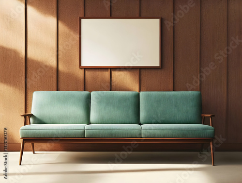 Mid-century Modern Teal Sofa and Blank Frame Rest Against a Warm Wood Panel Wall in a Sunlit Room