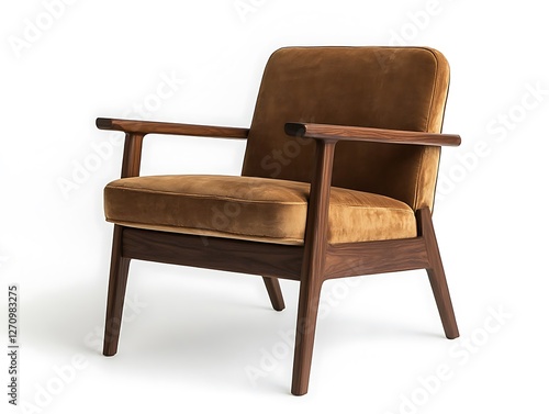 Mid-century wooden armchair with a rich walnut tone, set against a white neutral background