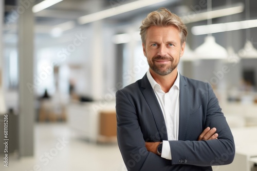 middle age adult man happy expression in a modern minimalist company. ai generated