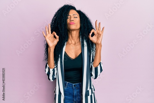 Middle age african american woman wearing casual clothes relax and smiling with eyes closed doing meditation gesture with fingers. yoga concept.
